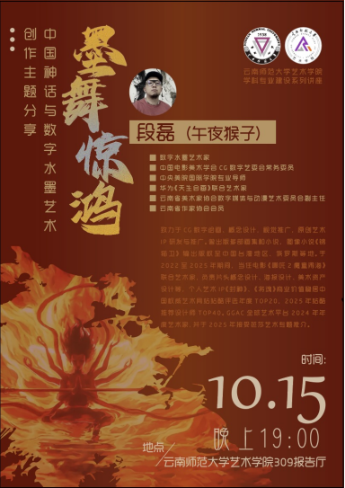10月15日,数字水墨艺术家、电影概念设计师、小说家段磊先生应邀莅临艺术学院,在明德5号楼309报告厅带来了一场题为“墨舞惊鸿——中国神话与数字水墨艺术创作”的精彩讲座,艺术学院师生二百余人共同参与。